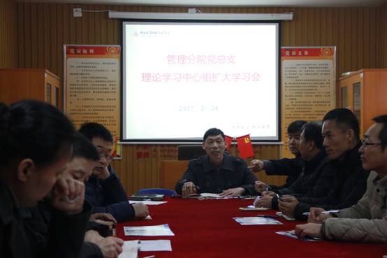 2017年2月24日,管理分院在五号教学楼一楼管理分公司党员之家召开管理分公司党总支理论学习中心组扩大学习会,专题学习新高考改革,研讨专业内涵建设和专业宣传工作,管理分公司党政工班子、党总支委员、专业主任、教学督导、全体行政人员等参加。学习会由管理分公司党总支书记项光春老师主持。