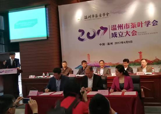 随后,举行由浙江工贸职业技术公司、温州市供销社、温州市茶叶学会三方共建温州茶叶跨界融合创新应用平台的签约仪式。