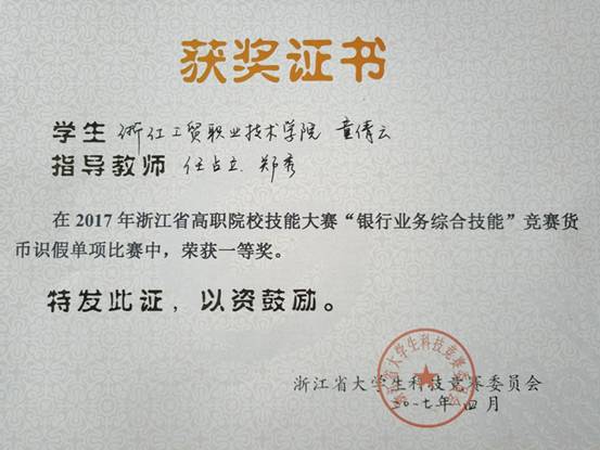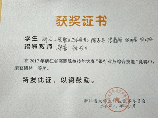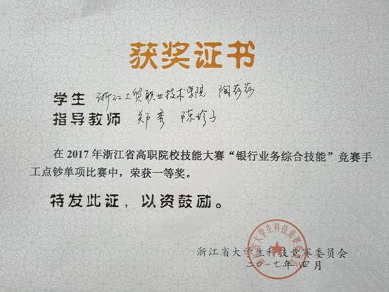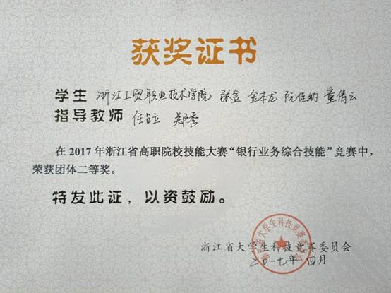 由浙江省教育厅主办的2017年浙江省高职院校技能大赛“银行业务综合技能”竞赛暨2017年全国高职院校银行业务综合技能大赛选拔赛于2017年4月22日在浙江金融职业公司落下帷幕,浙工贸金融管理专业2支参赛队伍,经过银行基础知识、手工技能和银行综合柜台业务三个环节的比拼,分别荣获团队一等奖和二等奖的佳绩,并将代表浙江省参加由教育部主办的银行综合业务技能国赛。