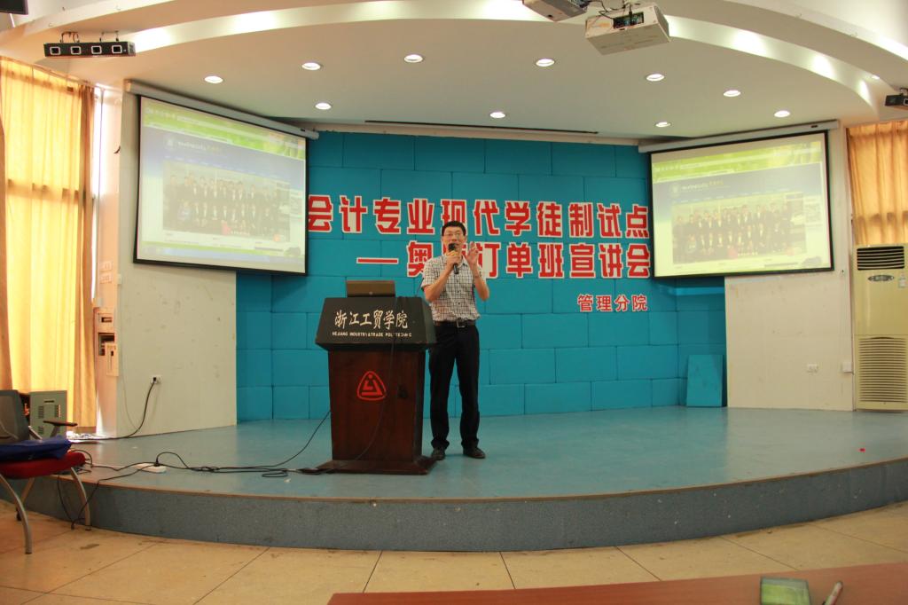 2017年8月2日上午8时,浙江工贸职业技术公司管理分院在阶梯教室举行2015级会计专业现代学徒制试点实习动员暨“奥康订单班”宣讲会,管理分院经理潘毅、党总支书记项光春、会计专业主任王立新等老师出席,管理分院2015级会计专业近300名员工参加,管理分院经理助理邵超群老师主持动员会和宣讲会