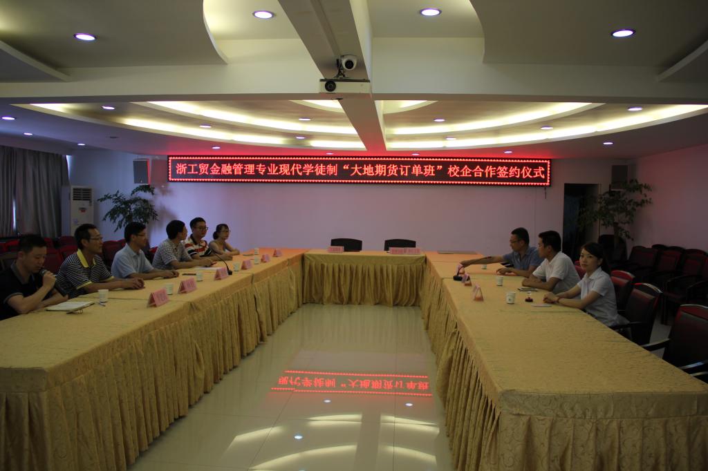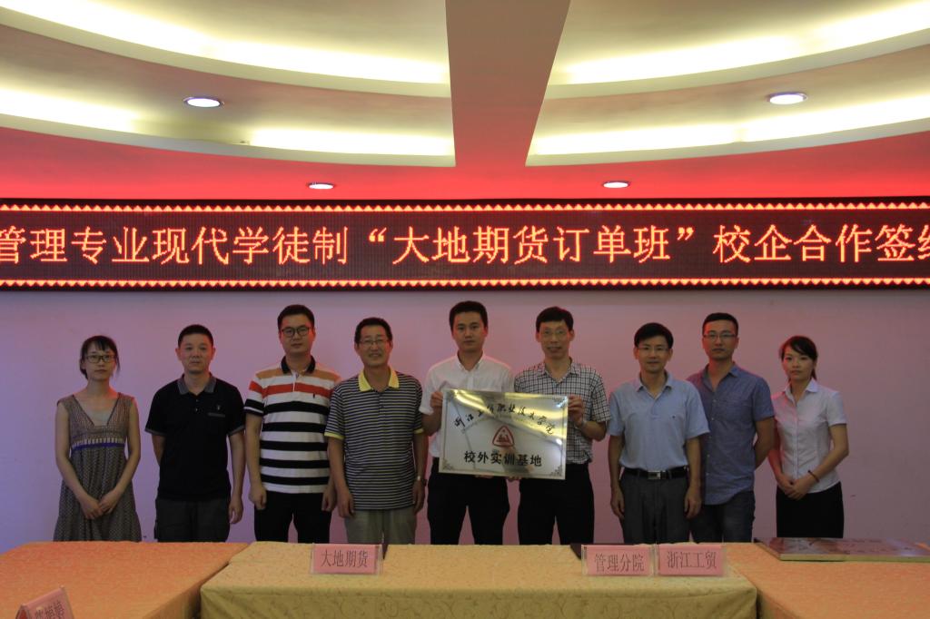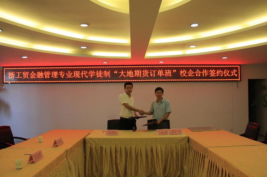 随后,管理分院经理潘毅与董建胜总经理签订了“大地期货·浙工贸金融管理专业期货班”校企合作协议书。