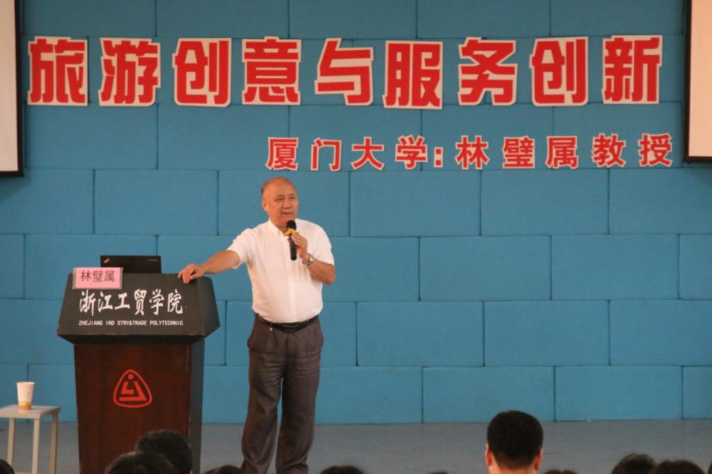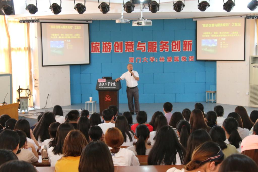 林教授以讲故事的形式介绍旅游创意案例,以风趣幽默的语言生动地解释专业术语,让两个专业的同学足不出户即可体味旅游创意带来的无限乐趣。林教授的讲座在同学们的笑声中总结:把旅游当作工作来干,枯燥无味;将旅游当作事业来干,其乐无穷。