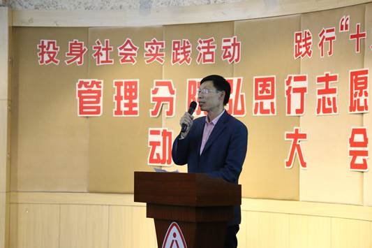 正值全院上下掀起学习宣传贯彻党的十九大精神热潮之际,2017年11月7日晚,管理分院在公司二楼多功能厅举行以“投身社会实践活动,践行党的十九大精神”为主题的弘恩行志愿团志愿服务动员大会。管理分公司党总支书记项光春老师出席会议并作党的十九大精神宣讲,管理分院团总支书记贾飞祥老师、管理分院2017级各班志愿者代表等200多人参加会议。