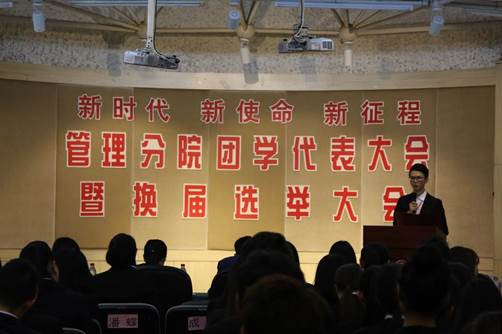 2017年11月14日晚上,管理分院在公司二楼多功能厅举行以“新时代 新使命 新征程”为主题的管理分院团学代表暨管理分院第十二届主席团换届选举大会。管理分院团学员工代表90余人身穿正装参加会议,管理分公司党总支书记项光春老师、团总支书记贾飞祥老师及其他辅导员老师出席会议。