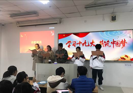 这场由同学们自主策划的主题班会,以学习党的十九大精神为主线,内容丰富,形式多样,有同学们自己录制的“十九岁的我想对党的十九大说”MV视频播放、《学习党的十九大、永远跟党走》诗歌朗诵、《学习党的十九大》激情演讲、《龙的传人》大合唱、“校园青春歌曲联唱”等员工喜爱的寓教于乐的节目,使同学们在寓教于乐中进一步了解党的十九大精神和社会主义核心价值观的内涵。