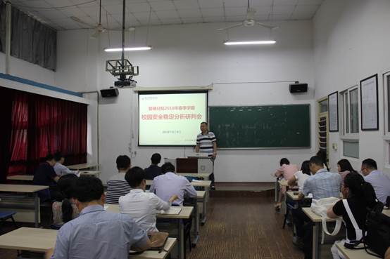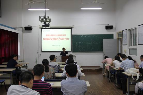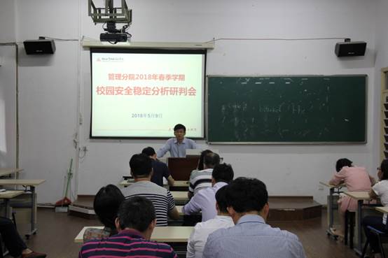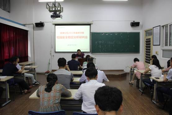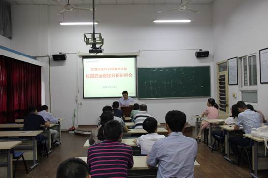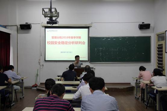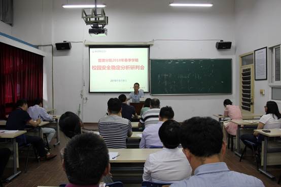 高校校园安全稳定工作是高校管理工作的重要组成部分,是高校一切工作的基础和底线,高校的安全稳定工作要贯彻“预防为主、安全第一”的方针,按照“谁主管、谁负责”、“一岗双责”的原则,逐级、按岗位落实安全稳定工作责任制。根据校园安全稳定工作责任制的有关要求,2018年5月9日下午,管理分院在5208教室召开了2018年春季学期校园安全稳定分析研判会,管理分院全体教职工、全体班主任参加。会议由管理分公司党总支书记项光春主持。
