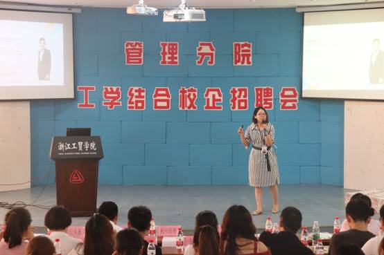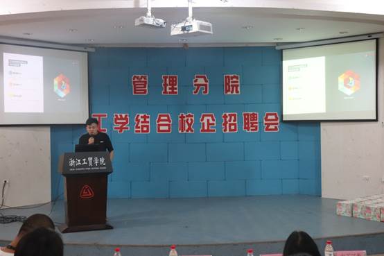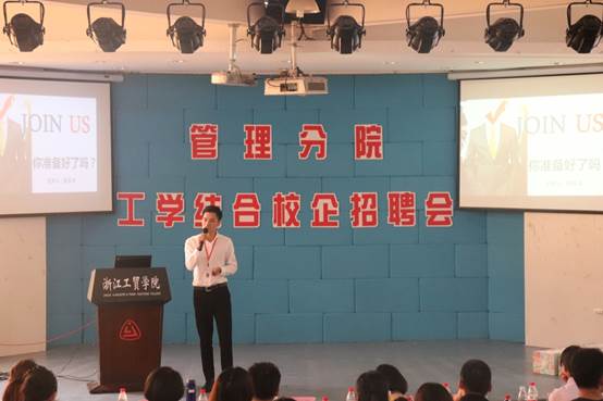 在管理分院经理潘毅老师简短致辞后,宣讲会随即开始,14家企业人力资源负责人纷纷上台展示企业特色、企业环境、招聘岗位、工资待遇等,帮助同学们更好地了解各企业的企业文化,发展现状及前景等状况,方便同学们更好地选择适合自己的企业。其中,也有毕业于管理分院的员工,他们以自身的经历为切入点,向在场的同学们展现了他们企业的独特魅力。同时,各家企业纷纷向同学们抛出橄榄枝,为实习生们提供了优美的企业环境、进修培训、各类社会保险、各类补贴、免费提供食宿等的优惠条件,现场气氛热烈,也很大地提高了同学们的热情和信心。