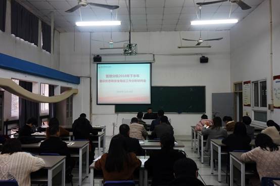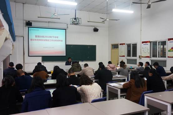 为贯彻落实上级和公司党委关于意识形态工作和校园安全稳定工作的决策部署,落实意识形态工作责任制、校园安全稳定工作责任制,为公司第三代党代会的胜利召开提供和谐稳定的环境,管理分院于2018年12月19日下午在5209教室召开2018年下半年意识形态和安全稳定工作分析研判会。管理分院全体教职工、全体班主任参加,会议由管理分公司党总支书记项光春主持。