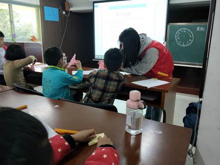 11月4日,志愿团6位志愿者满怀期待地来到了沿江文化礼堂,为孩子们精心准备了“数字的碰撞”、“手工小课堂”、“文明礼仪”、“语言的魅力”等课程。“数字的碰撞”志愿者老师教小朋友学会看时间,讲解分针、时针的含义。还教小朋友们安排一天的作息时间表,让他们懂得珍惜时间。“手工小课堂”让孩子们学会折千纸鹤,学会传递美好祝愿。“做人先学礼”是人生的第一课,“文明礼仪”课让孩子们学习了“文明礼仪”中的“集团礼仪”,志愿者老师先给小朋友们看了关于礼仪的视频,并提问小朋友们从视频中学到了些什么,“在楼梯上碰到老师要问好,还要让老师先走!”“要对同学好,不能骂别人!”等,小朋友们纷纷说出自己的想法。这节课让小朋友们学会如何在生活中做到以礼待人。在“语言的魅力”这堂课中,老师让孩子们思考一个“日”和“口”字添一笔能变成什么字,带孩子们领略到汉字的神奇。小朋友们都积极地参与,与志愿者老师度过了美好又充实的一天。