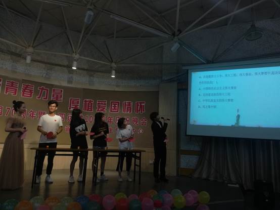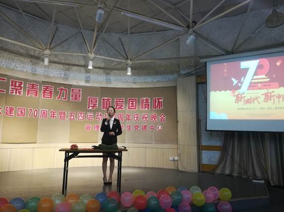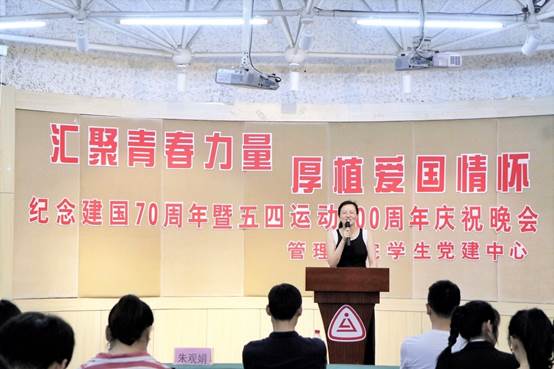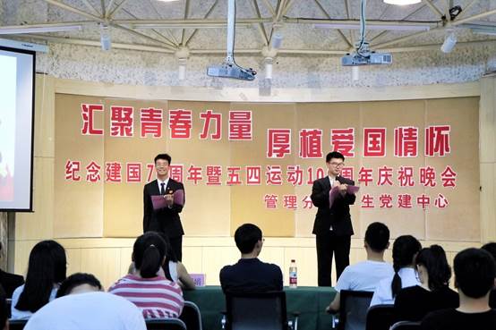 2019年6月5日晚,由管理分院员工党建中心举办的以“汇聚青春力量,厚植爱国情怀”为主题的庆祝中华人民共和国成立70周年暨五四运动100周年庆祝晚会在公司多功能厅举行。管理分公司党总支书记项光春老师、管理分院第二员工党支部书记朱观娟老师、管理分院辅导员季焕磊老师出席,管理分院2017级员工预备党员、发展对象及2018级团支书和员工入党积极分子代表近150人参加活动。
