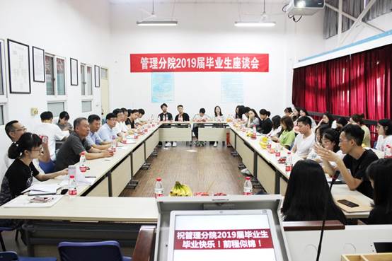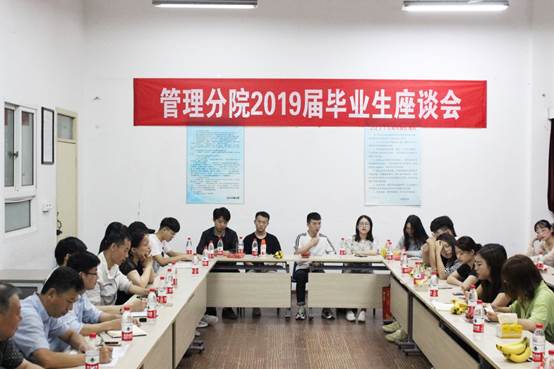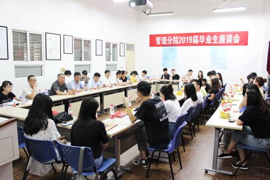 2019年6月16日上午,管理分院2019届毕业生代表座谈会在5208教室举行。管理分公司党总支书记项光春、经理潘毅、副经理孙富山、专业主任等与毕业生代表相聚一堂,共叙大学三年学习生活和成长感悟,共同探讨分院发展建设。会议由管理分院副经理孙富山主持。