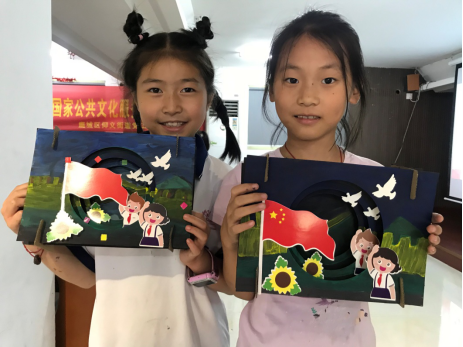 “向国旗敬礼”主题绘画课上,志愿者老师先向小朋友们教授有关国旗的知识,再让小朋友们将四层画板一层一层涂上颜料,并把它们拼接在一起。小朋友们把自己对祖国的热爱都融入在这一笔一画中。在志愿者老师的帮助下,每个小朋友都完成了自己的作品,他们的脸上都洋溢着灿烂的笑容。