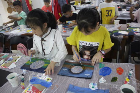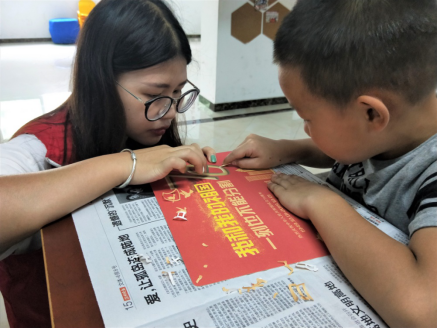 活动开始前,弘恩行志愿团的老师以朗诵爱国诗歌的形式带社区青少年们走近祖国的生日——“国庆节”,在阵阵朗读声中表达了他们对祖国的尊敬和热爱。“新中国成立70周年”主题沙画课上,小朋友们仔细用牙签挑掉贴纸,然后一笔一画将沙子撒好,每个角落都仔仔细细去铺满,一幅幅金灿灿的作品,就像小朋友们的爱国之心一样闪耀。