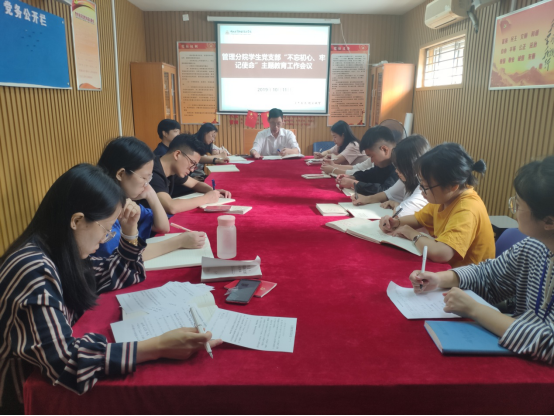 项老师在讲话中,首先肯定了员工党支部主题教育部署以来各方面的工作,同时提出了下一步的具体要求。一是要进一步组织全体党员通过各种方式通读《习近平关于“不忘初心、牢记使命”论述摘编》和《党章》,学习习近平总书记关于教育改革的讲话精神。尤其是在企业实习的员工党员要根据实际情况布置学习任务,并采取各种方式管控在外实习员工党员的学习进展;二是组织安排好党员志愿服务项目,在外实习的员工党员可以安排员工为企业做一件志愿服务好事;三是创新主题教育活动方式,把主题教育活动融入到员工学风建设、校园文化建设、寝室文化建设等中去,融入到员工思想政治教育工作中去,以主题教育的实际效果推进立德树人工作;四是认真组织党员对照党章党纪查找自身问题和不足,为开好组织生活会和党员民主评议做好准备。