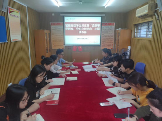 为深入学习贯彻习近平新时代中国特色社会主义思想,按照管理分公司党总支“不忘初心、牢记使命”主题教育工作推进计划,管理分院旅游酒店专业党支部、会计金融专业党支部、人力资源管理专业党支部、员工党支部等四个党支部于2019年10月15日至16日分别召开了“读原著学原文、守初心担使命”主题读书会。管理分院各党支部全体党员参加了会议,会议由各党支部书记主持。