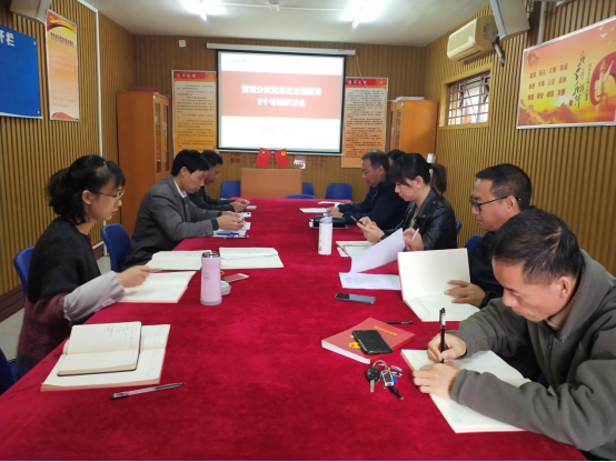 根据“不忘初心、牢记使命”主题教育总体部署,管理分公司党总支于2019年11月27日下午在党员之家举行主题教育“八个专题”集中学习研讨会,管理分公司党政班子成员、各党支部书记参加,公司主题教育督察组成员郑君山老师出席会议,研讨会由管理分公司党总支书记项光春老师主持。