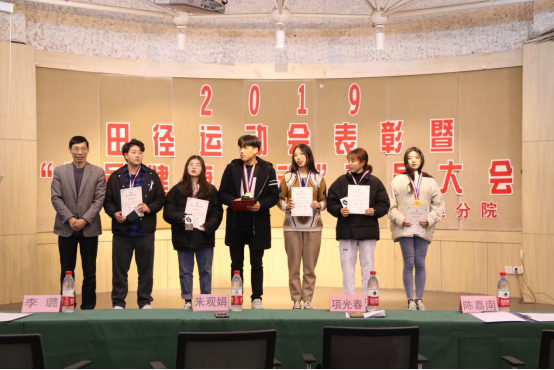 表彰会上,管理分院团总支副书记陈嘉南同学作运动会工作总结。项光春老师和朱观娟老师分别为在运动会上表现突出的运动员和精神文明班级进行颁奖。