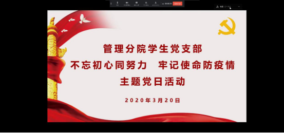 2020年3月20日下午管理分院员工党支部召开了“不忘初心同努力,牢记使命防疫情”线上主题党日活动。本次活动由员工党支部书记陈君老师主持,参加此次活动的有管理分院辅导员朱观娟老师、贾飞祥老师、陈赛群老师、季焕磊老师以及全体员工党员。