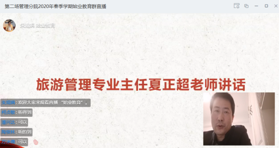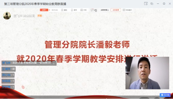 2020年4月8日晚上,管理分院通过钉钉直播方式分3场召开2020春季学期集中始业教育大会,管理分公司党总支书记项光春老师、经理潘毅老师、各专业主任、2018级和2019级全体班主任及1483名2018和2019级员工等参加。大会由辅导员主持。