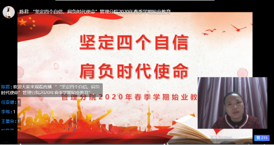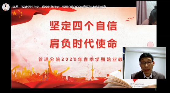 管理分院经理潘毅老师结合自己的感受,以“自豪、感恩、自强、和善”这八个词总结出这次疫情背景下的工作学习感悟,不仅给同学们带来了启发,更多的是带给同学们一种使命感,争做一名新时代有能力,有自信,有担当的优秀青年。