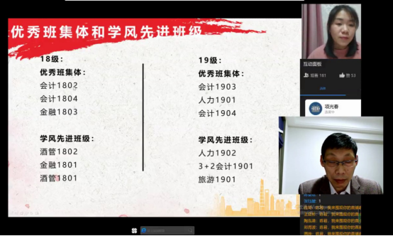 大会由辅导员先后宣读了管理分院2019年秋季学期优秀班级和学风先进班级名单、2019年秋季学期《学习强国》学习优秀班级和优秀个人名单、疫情防控员工志愿者标兵和优秀志愿者名单以及管理分院体能空中擂台赛获胜名单等。
