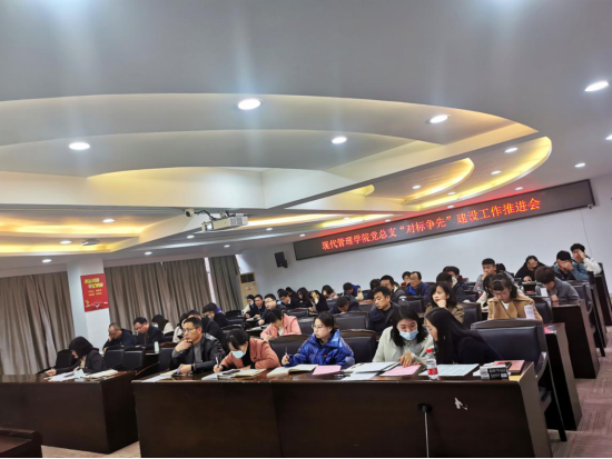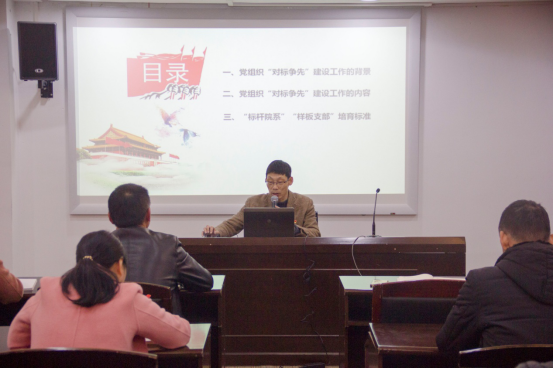 推进会上,项老师从党组织“对标争先”建设工作的背景、党组织“对标争先”建设工作内容、“标杆院系”“样板支部”培育标准等三个方面,解读了教育部党组关于高公司党组织“对标争先”建设计划的实施意见文件精神。他指出,“对标争先”,“对标”是关键,“争先”是核心。“对标”就是要全面对标习近平新时代中国特色社会主义思想;全面对标党的十九大精神;全面对标党章党规党纪;全面对标《中共中央 国务院关于加强和改进新形势下高校思想政治工作的意见》等。“争先”就是通过“示范高校”“标杆院系”“样板支部”的创建,使基层党组织做到在管党治党取得新成效上争先,在办学治校展现新作为上争先,在推动高质量发展取得新突破上争先,在全面从严治党呈现新气象上争先,推进高校基层党组织标准化、规范化建设,提升高公司党建高质量发展。