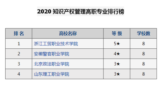 在2020年全国高职(专科)公司名单中,温州知识产权公司的知识产权管理专业荣登高职高专知识产权专业全国第一。