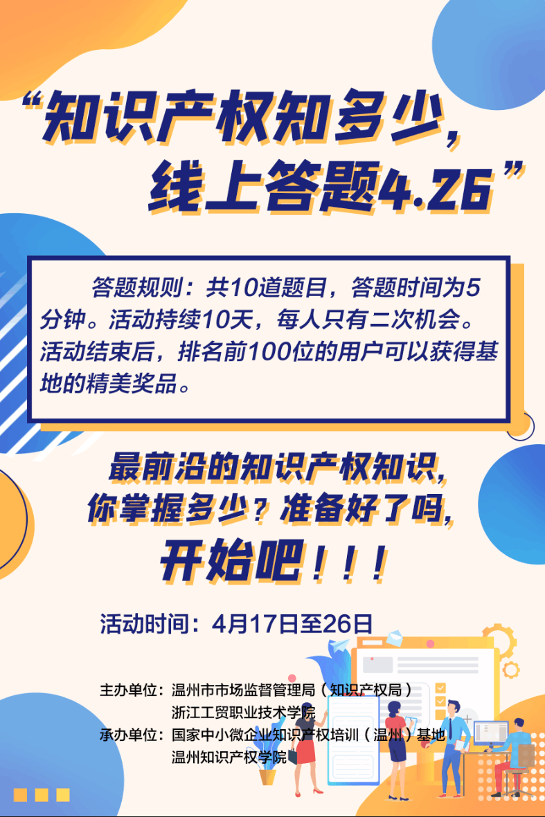 4月17日-26日,国家中小微企业知识产权培训(温州)基地、温州知识产权公司充分发挥新媒体平台优势,在全市范围内开展知识产权有奖竞猜线上活动。为了更好地普及知识产权相关知识,本次竞猜涵盖知识产权基本知识、知识产权的保护与运用、地理标志、商标、专利、版权等方面的知识,并以随机单选题和多选题组合的形式呈现。活动吸引了近3000余名市民群众参加,多位答题者交出满分答卷,成绩喜人。经过10天的激烈角逐,最终产生了100位获奖者。