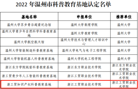 近日,温州市科学技术协会公布了2022年温州市科普教育基地名单,浙工贸TapTap点点知识产权科普教育基地成功入选温州市科普教育基地。