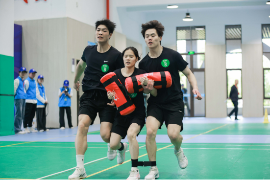 该模块主要考察参赛队员力量、协调、灵敏、速度、耐力、柔韧等基本体能素质,同时还考验参赛队员之间的团队协作能力。比赛场上,队友之间互相鼓励、加油、威助喊,铆足了劲、争分夺秒,力争在最短的时间内规范完成各项体能项目的比赛。