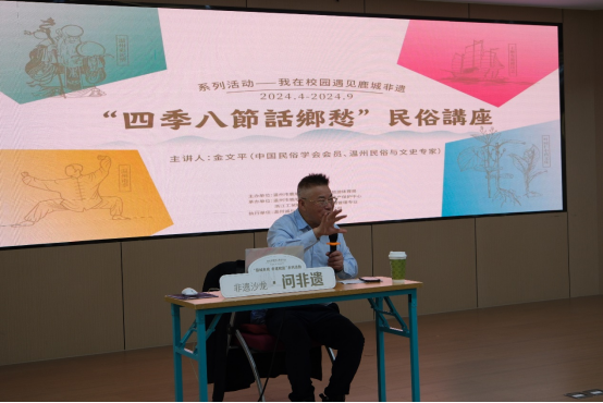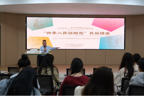 在1号楼多功能厅,非遗讲座如期举行。讲座邀请了中国民俗学会会员、温州民俗与文史专家金文平老师,为师生们深入讲解了温州非遗的历史渊源、传承发展以及保护利用等方面的知识。讲座内容丰富、深入浅出,让师生们对非遗文化有了更加全面深入的认识。