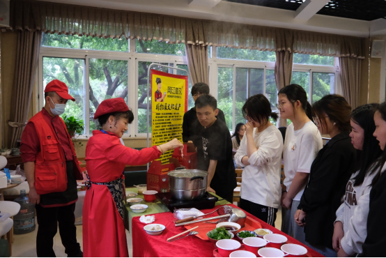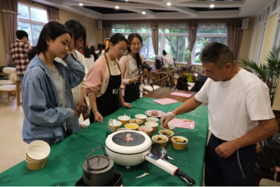 在柚名堂茶室,非遗小吃(馄饨、鱼丸)制作项目更是热闹非凡。师生们亲手制作温州传统小吃,不仅品尝到了美食,更对非遗小吃的制作技艺有了更深的了解。老温州馄饨担的馄饨皮薄馅足,啊红鱼丸鲜嫩可口,这些美味的小吃让师生们流连忘返。