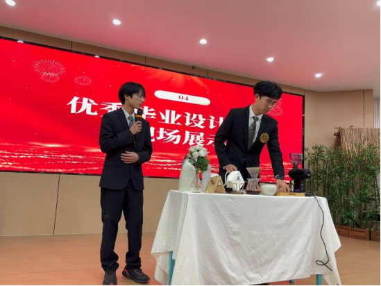 在开幕式上,还进行了优秀毕业设计现场展示环节,旅游管理专业带来了导游词讲解、茶艺展示,酒店管理与数字化运营专业的毕业生代表带来咖啡冲泡技能展示。