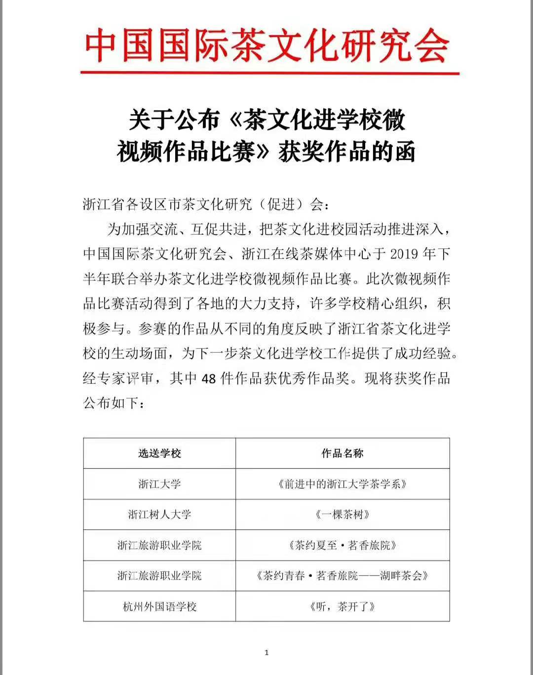 近日,中国国际茶文化研究会公布了2019年“茶文化进公司微视频作品比赛”获奖作品名单,由公司大益爱心茶室茶道艺术团选送的《向阳茶花》微视频与浙江大学选送的作品一道荣获优秀作品奖,这也是公司茶道艺术团2019年参加第六届茶奥会获得品饮茶艺“三金一铜”好成绩后的又一佳绩。