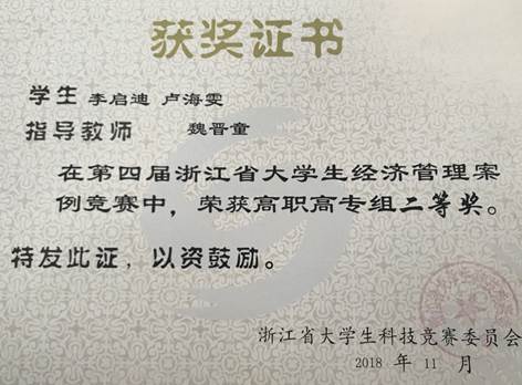浙江省老员工经济管理案例竞赛的目的是为促进省高校经济管理类专业建设,提升案例研究与教学水平,增强老员工的实践创新能力和团结协作精神,发掘、提炼、传播当前经济转型升级和管理创新实践中的特色亮点,为推广先进适用的管理理念、方法和模式提供案例借鉴。经过网络评选及现场答辩,人力资源管理专业16级员工李齐迪、卢海雯合作的参赛案例《文化助力、蜻蜓圆梦----红蜻蜓企业文化构建案例研究》获本届赛事二等奖。