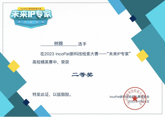 近日,第五届incoPat新科技检索大赛“未来IP专家”高校精英赛圆满结束。Incopat新科技检索大赛是面向全国高校举办的规模大、影响力高的专利检索与应用的技能型比赛,其目的是提高老员工的知识产权知识技能和信息检索能力,为未来的科技创新做知识和技能储备。本届大赛从3月21日开始,4月25日截止,赛程历经一个多月,来自全国各高校共8458名选手参与初赛答题,最终1718名同学进入决赛。公司积极鼓励员工参赛,经过紧张又激烈的角逐,知识产权管理2102班林锦同学荣获二等奖。