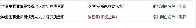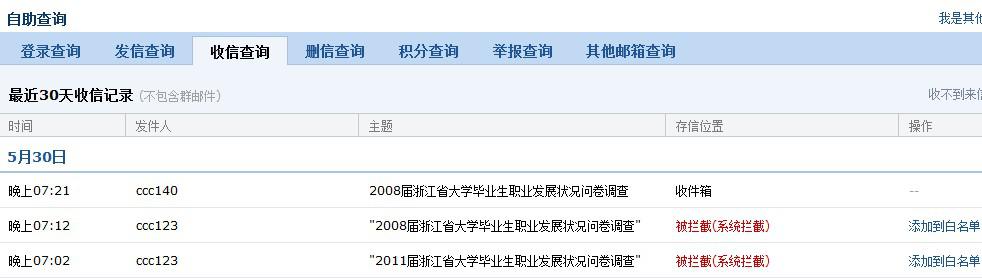 3.点击【收件查询】,出现以下界面,红色的为被拦截的邮件: