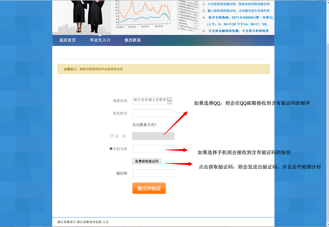 毕业生可以自行进入系统,填写手机号码或者QQ邮箱,系统会将验证码发送到手机短信或者QQ邮箱中,毕业生填写验证码进入答题页面。步骤如下: