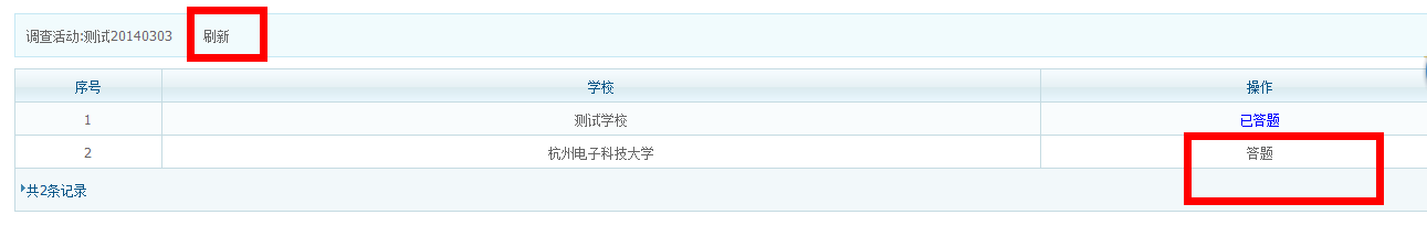 显示需要进行回答的公司,点击右侧答题链接进入,已回答的显示“已回答”字样。回答后点击列表上方刷新按钮可以查看当前答题情况。