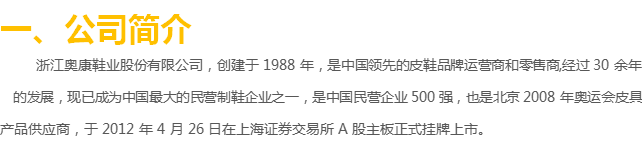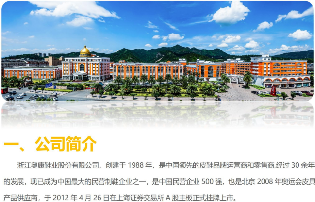 公司建立了行业第一所鞋类科技研究院、三大制造基地和上海华东运营中心,拥有奥康、康龙两个自有品牌,代理了美国运动鞋品牌SKECHERS(斯凯奇)和德国运动鞋品牌PUMA(彪马),并与国际体育用品零售巨头INTERSPORT(宜动体育)达成战略合作。同时,公司成功收购意大利知名皮鞋品牌VALLEVERDE(万利威德)的大中华区所有权,形成了横向一体化的经营模式。
