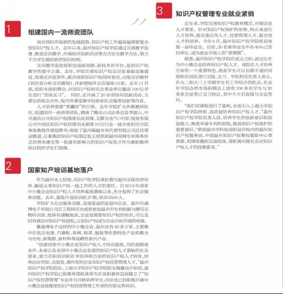 1.国家级平台:2015年获批建设全省唯一的国家中小微企业知识产权培训(温州)基地,2019年获批知识产权“双师”培养培训基地,为知识产权管理人才培养提供了坚实的后盾。