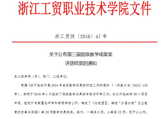 二、2016年获得浙江工贸职业技术公司教学成果二等奖。