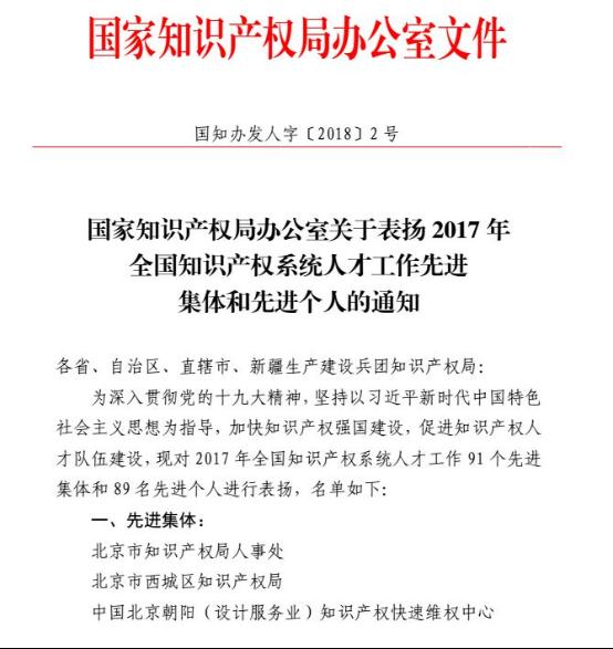 2017年国家知识产权局对知识产权系统人才工作先进集体的表彰文件。