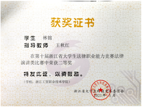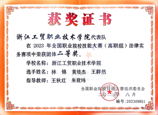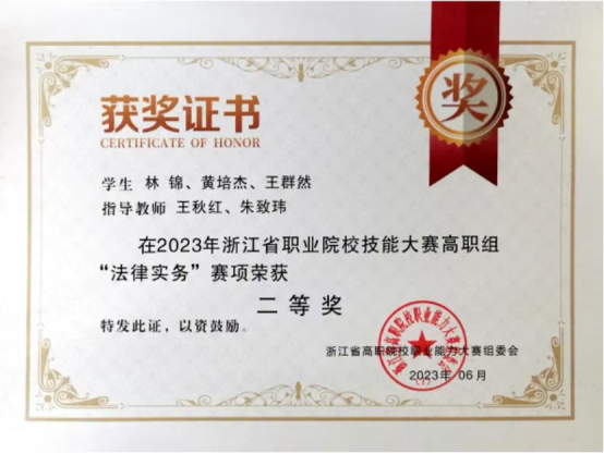 2023年全国职业院校技能大赛“法律实务”赛项全国二等奖。