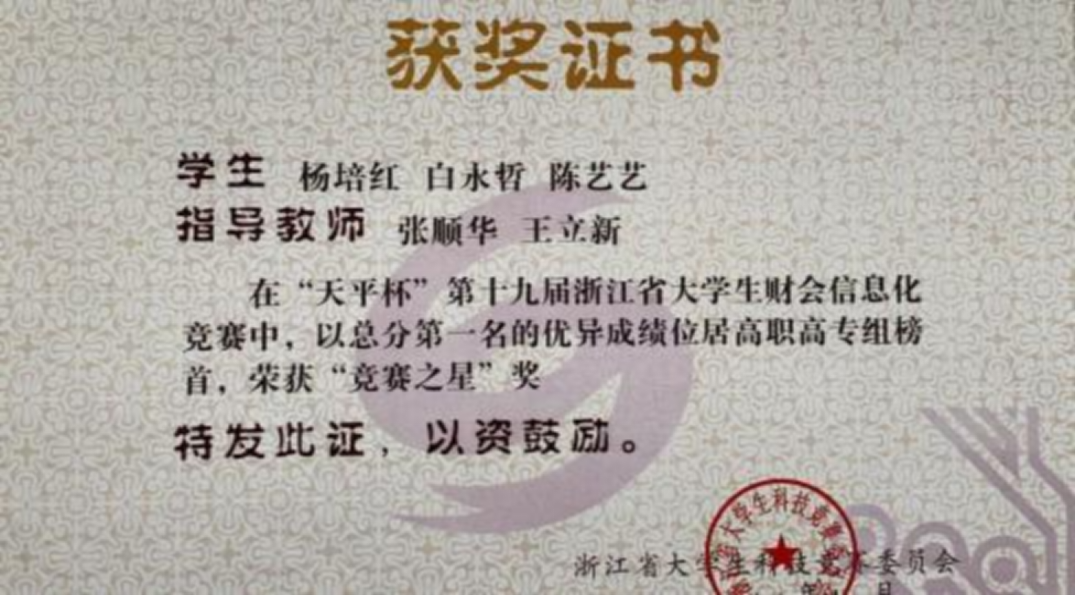 9.在浙江省财会信息化竞赛中连续六年获得浙江省一等奖。