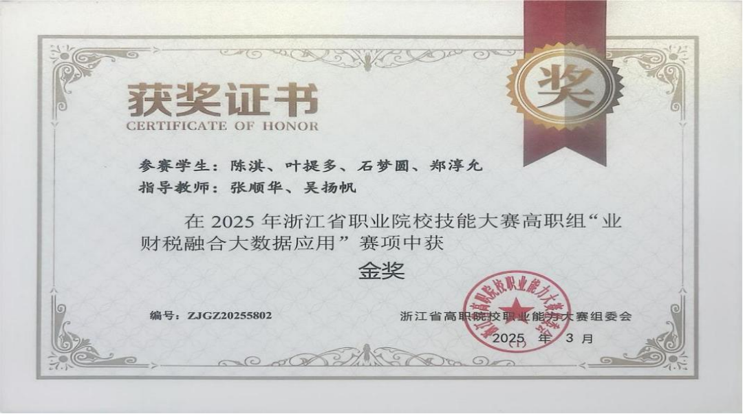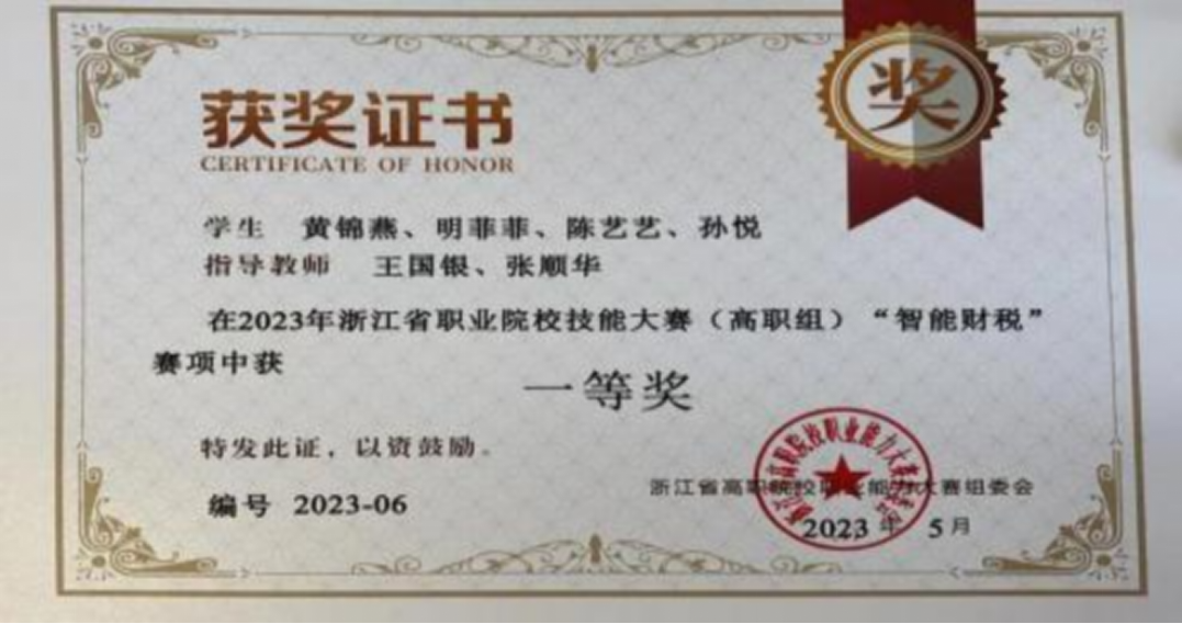 8.在浙江省职业技能大赛“智能财税”赛项中获得省一等奖2项;