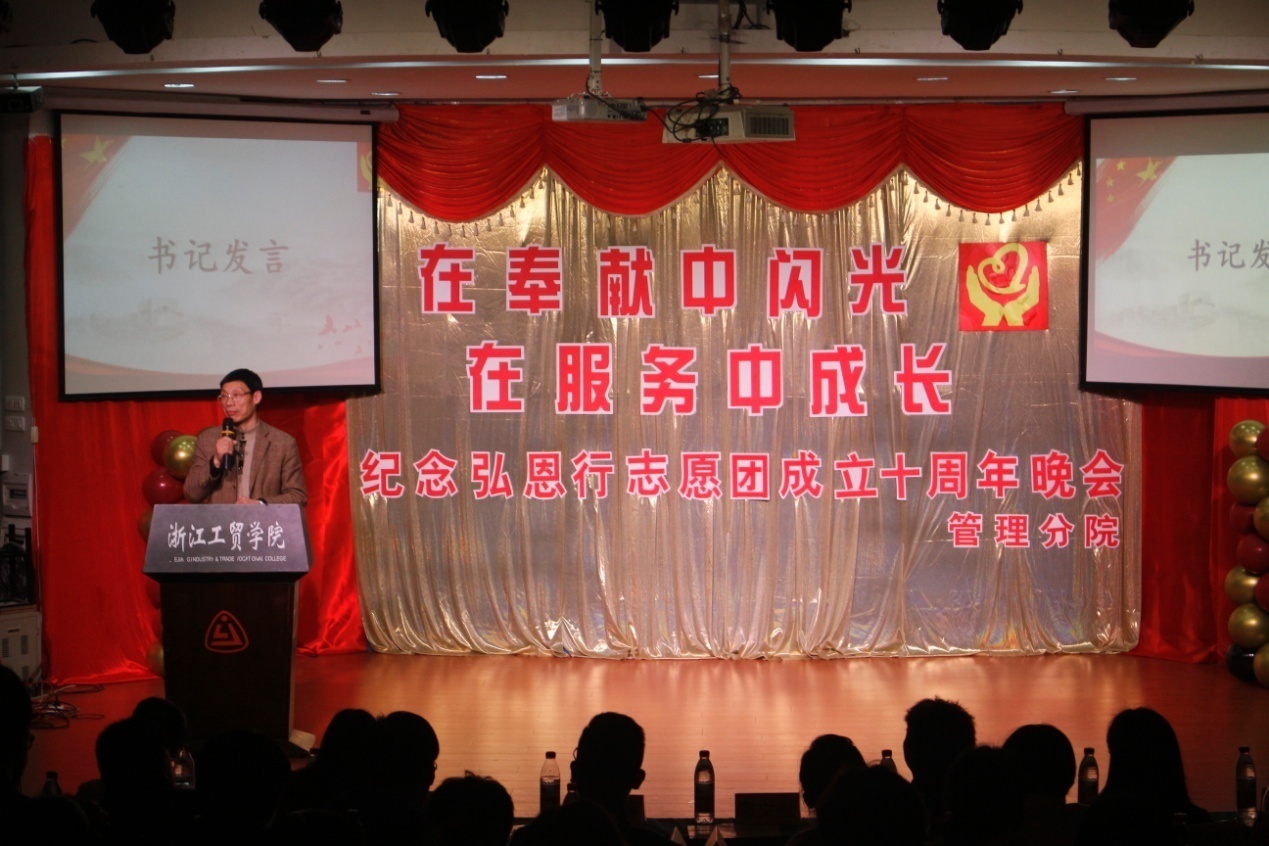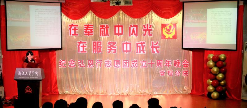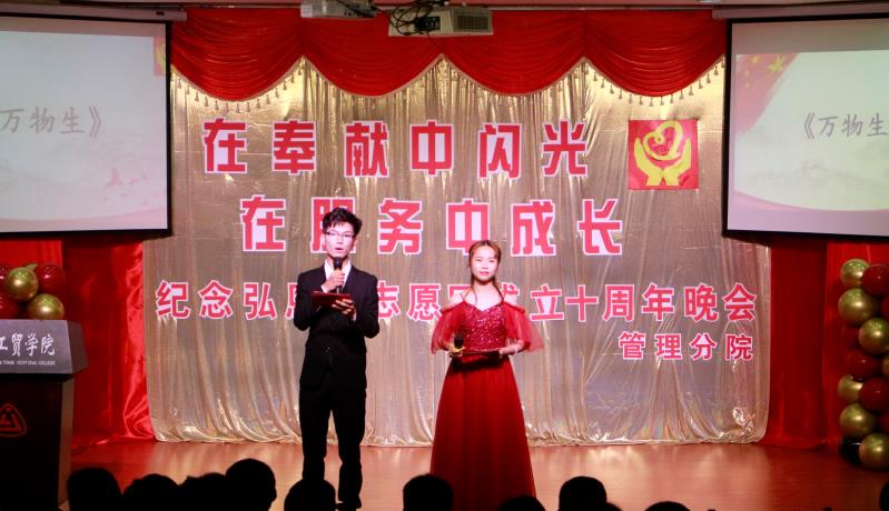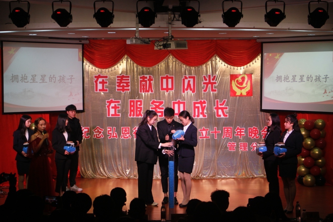 为了庆祝五四运动100周年,浙工贸管理分院弘恩行志愿团成立10周年,2019年3月26日晚,管理分院在阶梯教室举行了以“在奉献中闪光,在服务中成长”为主题的文艺晚会。浙江工贸职业技术公司员工处处长、团委书记廖文献老师,经贸分公司党总支书记张勰老师,管理分公司党总支书记项光春老师等领导莅临晚会指导,鹿城党群服务中心负责人陈贤达、公司团委张慧老师及各分院系辅导员代表等应邀出席,管理分院辅导员、管理分院历届青协部负责人代表以及管理分院2017.2018级员工代表共约400名参加晚会。