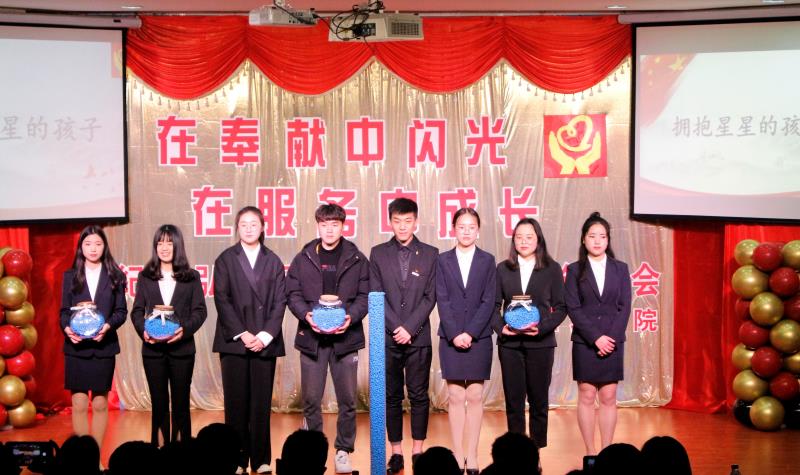 “点亮星星,守护未来”:关爱自闭症儿童公益“折纸星星”赠送仪式把晚会推向高潮。为了关爱自闭症儿童,用一盏盏星星灯点亮自闭症儿童的星空,管理分院团总支员工会发动2017级、2018级全体员工开展折星星活动,用自己亲手折的星星点亮自闭症儿童的星空,一份“星”意表达自己对自闭症儿童的关怀。鹿城党群负责人孙贤达老师接受了同学们亲手折的“星星”,并由他转送自闭症儿童。