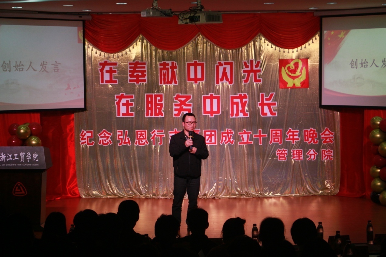 晚会接近尾声,管理分公司党总支书记项光春老师发表了讲话,他首先对为弘恩行志愿团10年来的发展给予支持的各级领导、老师表述感谢,对积极参与弘恩行志愿团志愿服务的历届员工表示慰问。