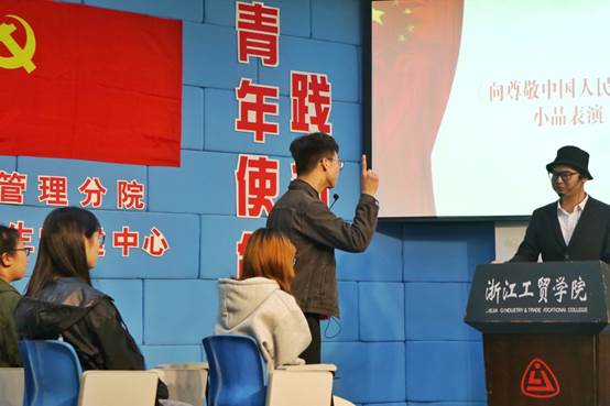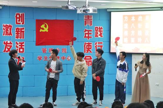而《九宫格找热词》游戏环节,把活动推向了高潮。在这个环节中,观众自愿上台参与,通过举牌抢答的方式,把分散在九宫格中的“新时代”“社会主义核心价值观”“八八战略”“最多跑一次”“两个一百年”等时事政治“热词”快速找出来,根据回答情况进行礼物奖励。在游戏过程中台上、台下的同学都十分专注的盯着九宫格,寻找关键词,现场互动活跃,同学们的兴致很高。当台上的同学迅速抢答并回答正确的时候,台下同学报以热烈的掌声,使同学们在获得快乐的同时,了解和学习到了不少党建知识和时政热词。